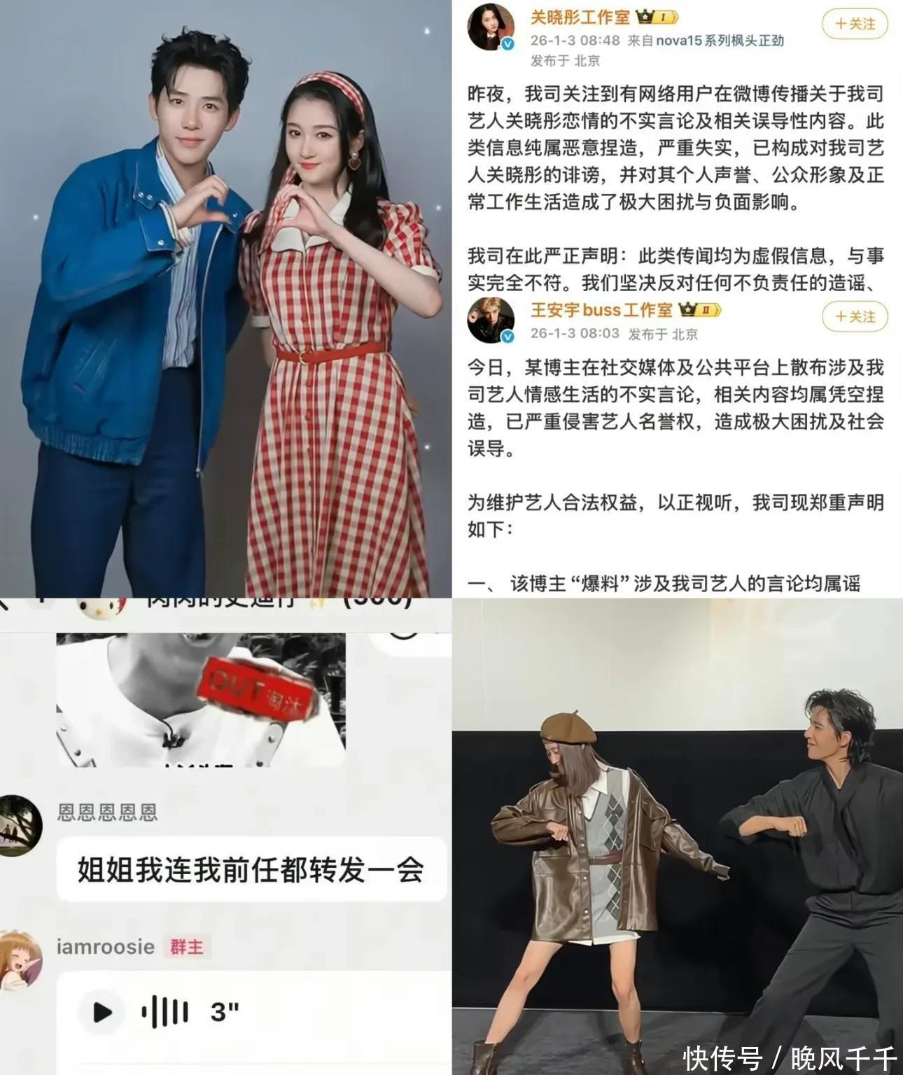 12. 王安宇:司晓迪人粉丝群爆料他和关晓彤正在谈恋爱,把无辜的关晓彤也拖进瓜田。王安宇工作室赶紧辟谣,称是凭空捏造的谣言,关晓彤工作室也同步发声明否认,称相关言论构成诽谤。