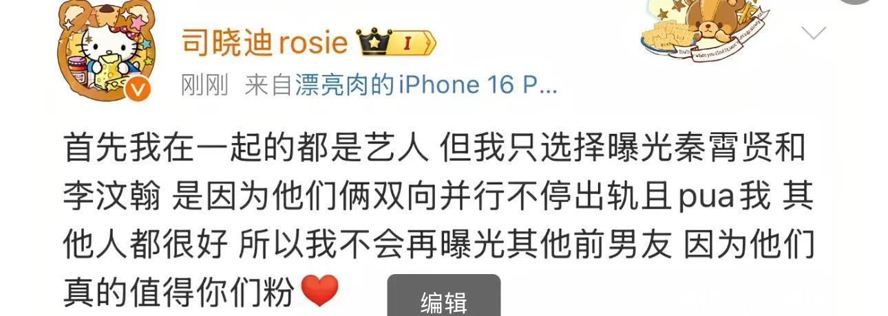 10.秦霄贤:司晓迪此次再次将他列入爆料名单,称两人处过对象,而秦霄贤同时和多个女生保持关系,自己还因这事被粉丝网暴到精神崩溃住院。秦霄贤本人及团队暂未对此做出回应,目前关于他的爆料还停留在司晓迪的单方面说法上,真假难辨。