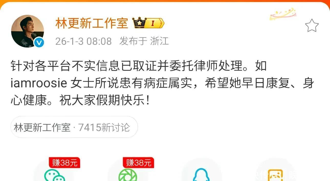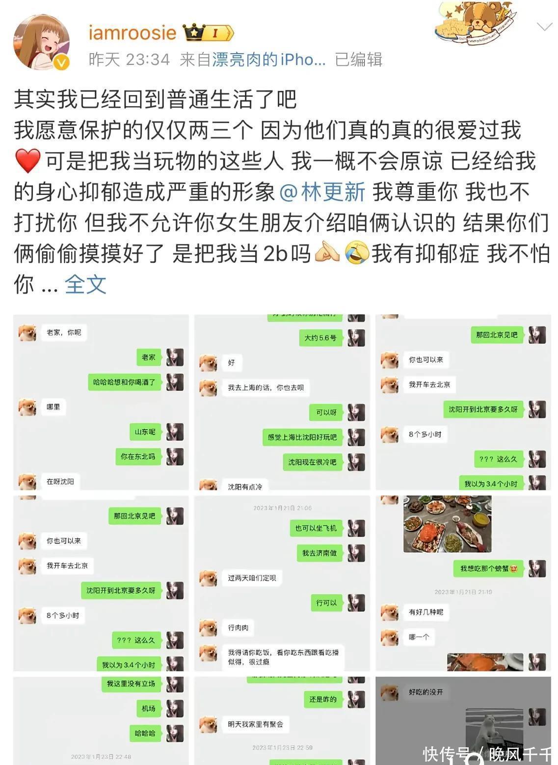 3.林更新:司晓迪直接喊话要求他道歉,称两人经朋友介绍认识,林更新曾说要小时车从沈阳来北京见她,结果转头就和介绍人在一起,把她当玩物,还导致自己患上严重抑郁症。她晒出包含相约吃大闸蟹内容的聊天记录,林更新工作室辟谣称是不实信息,若司晓迪患病属实则祝她早日康复。
