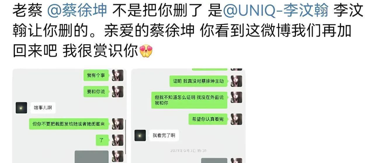 9. 蔡徐坤:未被单独爆料,只是司晓迪提及当初拉黑他,是因为李汶翰吃醋。