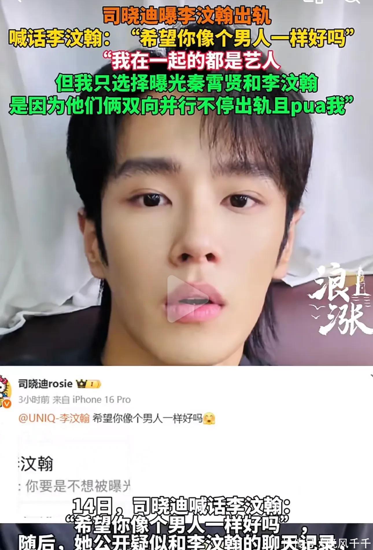 4. 李汶翰:司晓迪此次加码爆料,晒出聊天记录、情人节开车兜风视频,甚至还有李汶翰为了偷偷约会戴女式假发乔装的画面。她称李汶翰在《创造营》录制期间,常深夜跑去找她,还吐槽队友关系,只有她能懂他;同时控诉李汶翰脚踏几条船,还对她进行精神控制。另外她提到,当初拉黑蔡徐坤,就是因为李汶翰吃醋,这波也把蔡徐坤拉进了瓜田。至于李汶翰这边,他的团队暂未公开表态,到底是真是假,咱们也只能再等等看了。