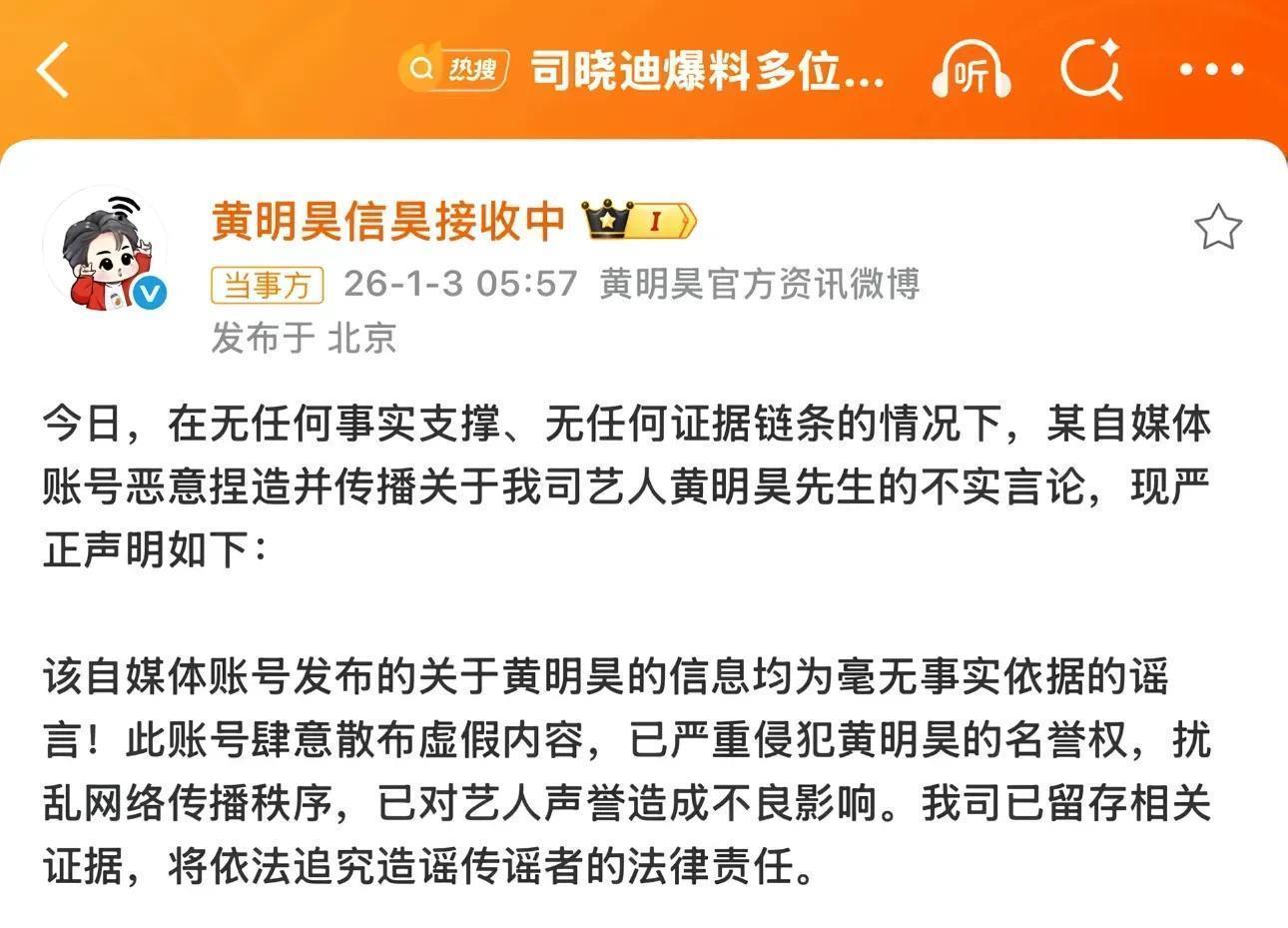 8. 黄明昊:司晓迪称和他有交集,黄明昊方直接否认,直言所有信息都是无依据的谣言,已留存证据将追责。