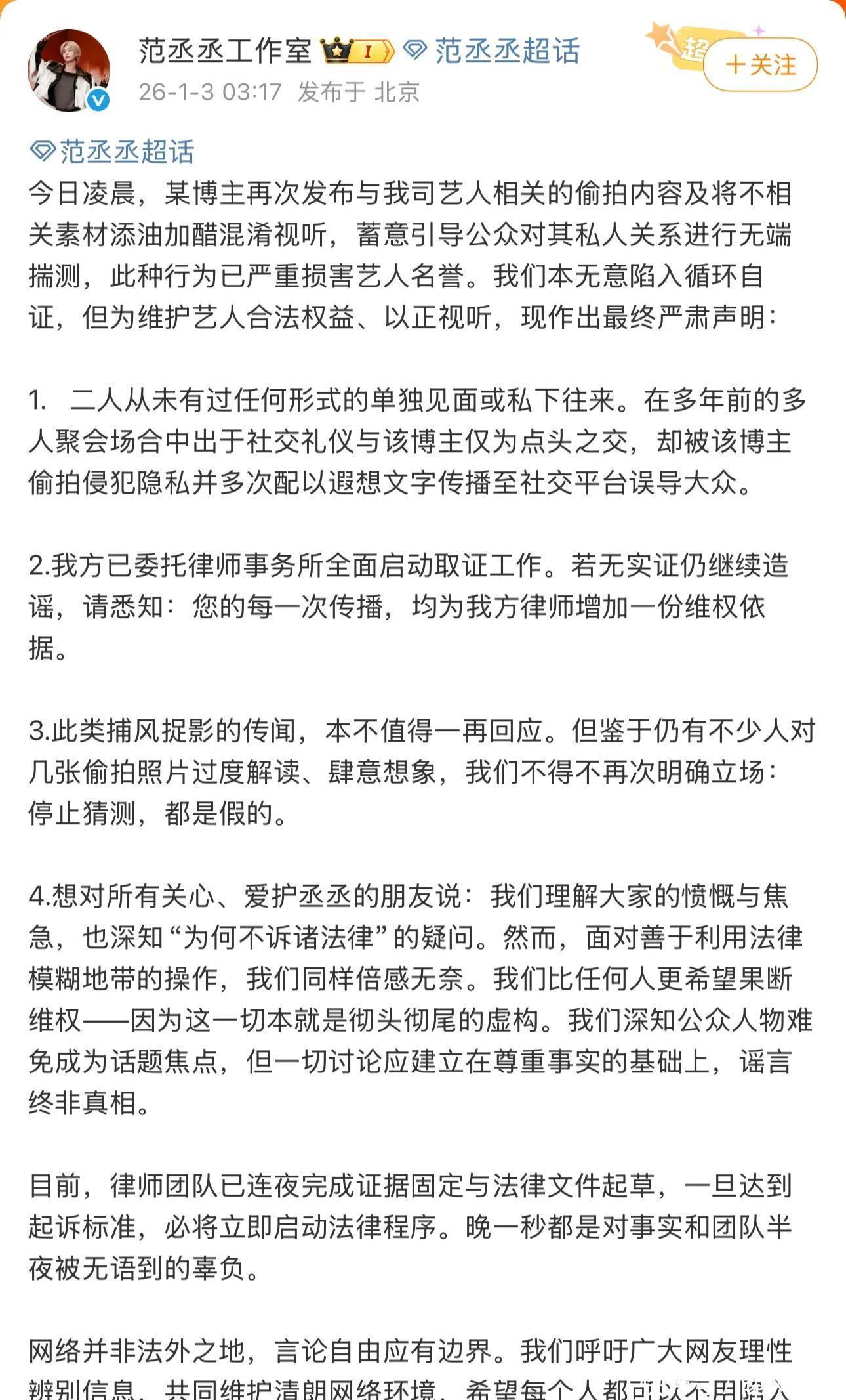 2. 范丞丞:司晓迪称他是自己青春里唯一喜欢的男孩子,晒出聚会照片和生日祝福聊天截图当证据,说两人做了好几年朋友。范丞丞方回应,只是多年前多人聚会时见过几面的点头之交,照片是司晓迪偷偷拍摄,存在故意误导,已通过区块链固定证据。